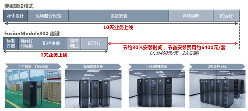 而传统机房是部件分批到货,到货时间不统一,施工进度严重依赖于部件到货时间,现场安装又比较复杂,耗时耗力,800安装费用相对传统解决方案一般能够节省6000多,对于代理商而言,节省了不小的一比开支。