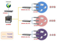 根据壶西实验中学的实际情况,我们采用三层网络架构实现基础网络的部署。在机房放置一台机箱式核心交换机XCM8806,总体负责学校全网所有主干连接,全局路由策略和处理。各主要楼栋各放置一台汇聚交换机M4100-26G-PoE,通过光纤与核心交换机连接,与各楼层的接入交换机采用网线连接。